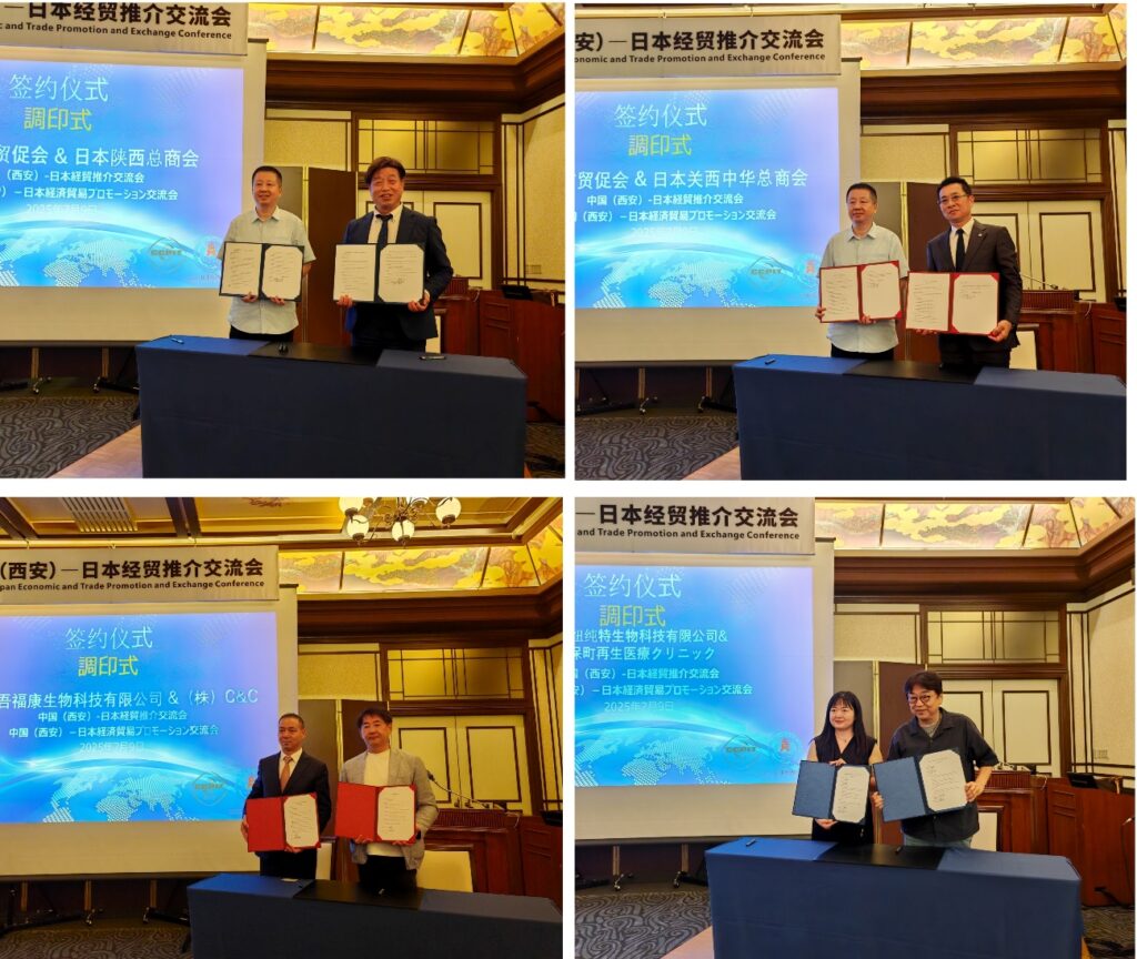会上,多项合作协议顺利签署,其中西安市贸促会分别与日本陕西总商会、日本关西中华总商会签署战略合作协议;陕西吾福康生物科技有限公司与株式会社C&C,西安纽纯特生物科技有限公司与神保町再生医疗医院签署战略合作协议。战略合作协议的签署,为后续实质性项目落地奠定了坚实基础。